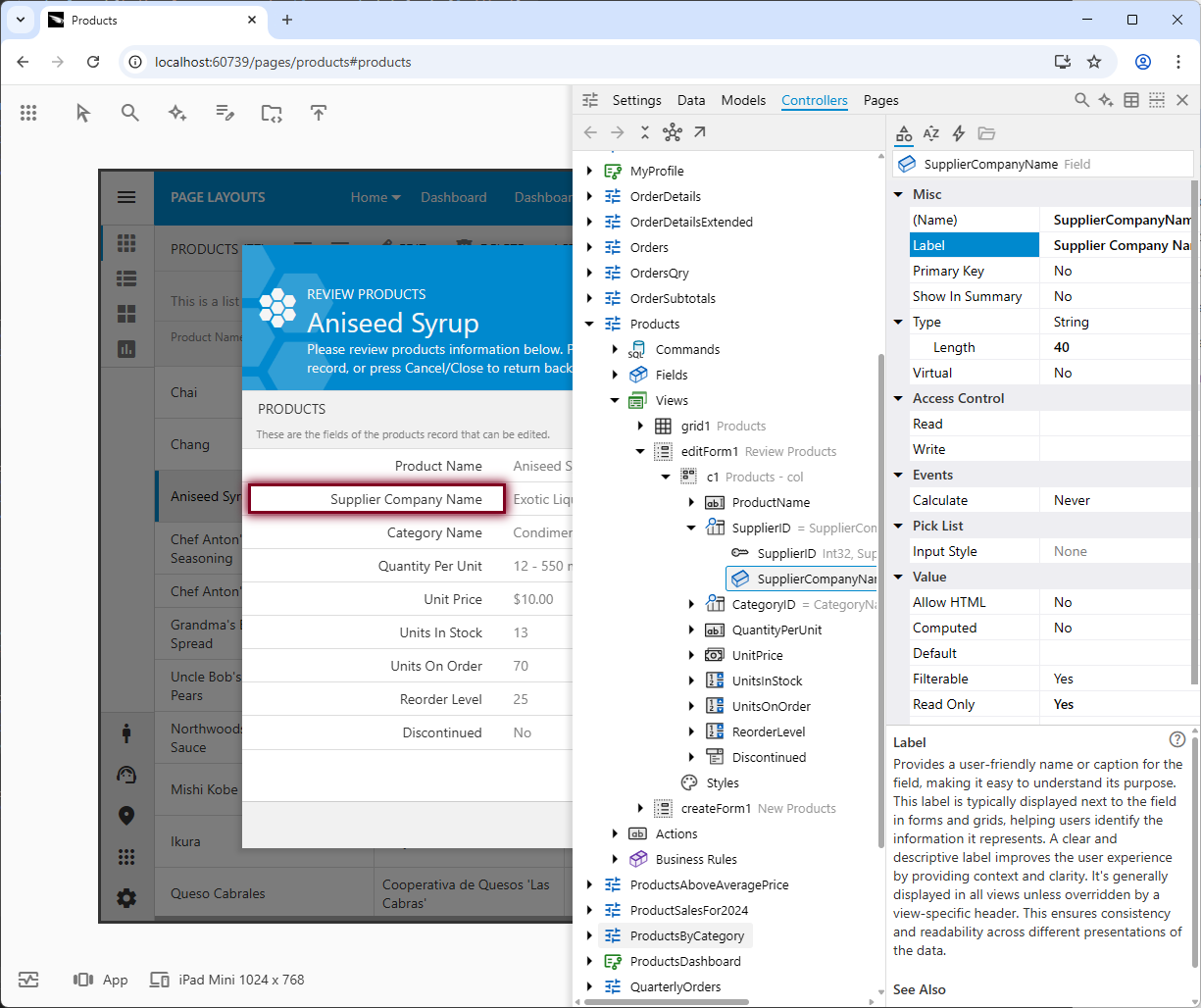 The screenshot displays the App Explorer following a live inspection of the "Supplier Company Name" column header. The image shows the attached hierarchy and properties side-by-side, with the "Label" property of the "ProductName" field selected. A brief description explains the property's purpose. Tabs within the title grant quick access to "Settings", “Data”, "Models", "Controllers", and "Pages". The right side of the title contains buttons for "Search", “Ask Builder”, "Display Hierarchy as Table", "Split Vertically", and "Close".