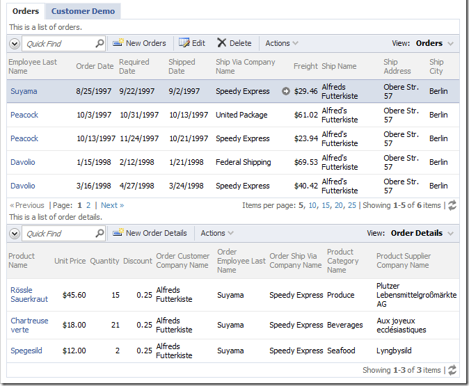 When your default web browser opens, navigate to Customers page. You are presented with a list of Customers. Select a customer, and the Orders and Customer Demo tabs of container2 will become visible. Select an Order, and relevant Order Details will appear underneath.