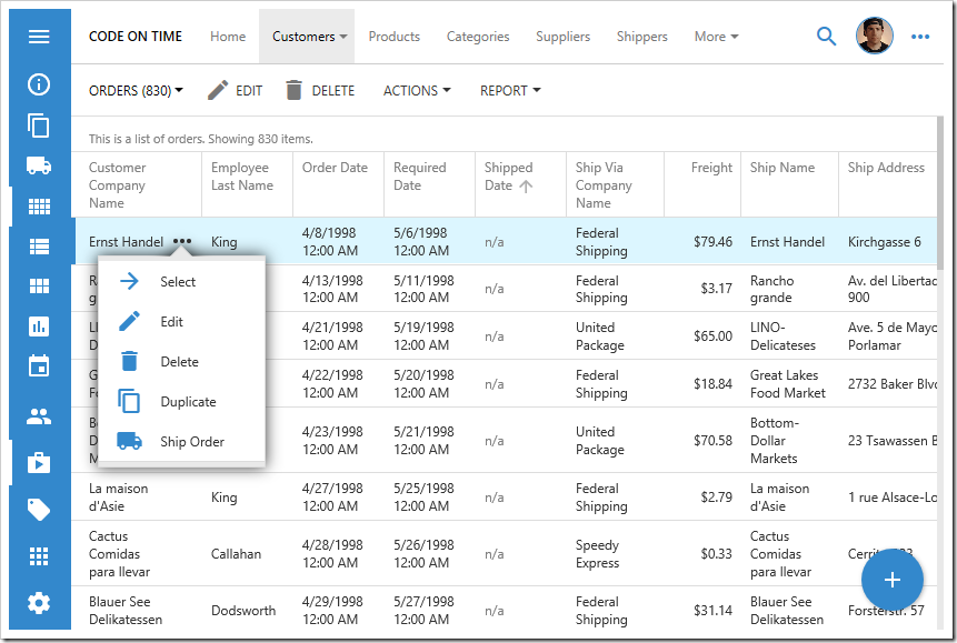 Let’s add an action to Orders page of the sample Northwind app that will mark an order as shipped. This action will have a custom icon.