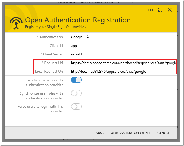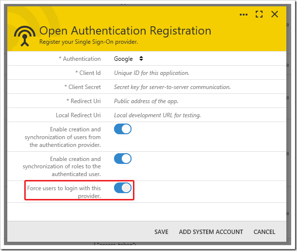 If “Synchronize user roles” is enabled, press ADD SYSTEM ACCOUNT to save the registration record. You will be redirected to the authentication provider to acquire permission to read user roles.
