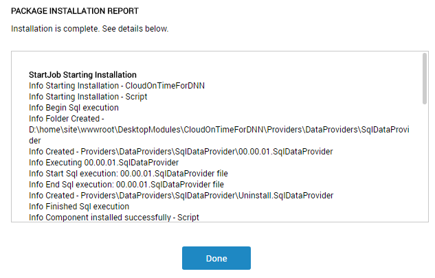 The module is now installed in your DotNetNuke instance.  Note that the website will restart, which may cause some delay immediately after installation.