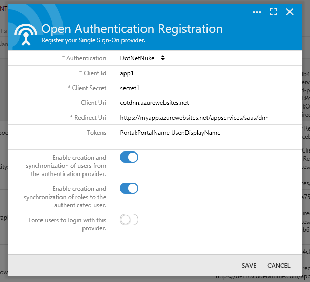 Press the checkmark icon to save the new record. Your app is now configured for authentication connections with DotNetNuke portal.