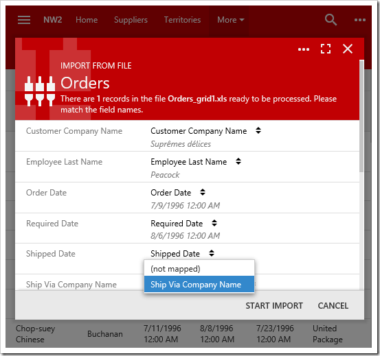 Second screen of the Import process allows the user to map columns from the imported file to fields in the controller.