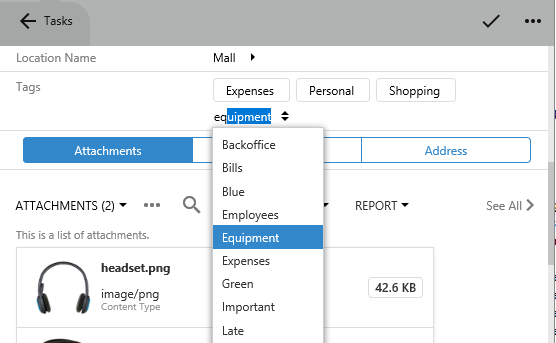 The "Tags" basket lookup shows multiple tags added to the task. A dropdown allows adding more tags.