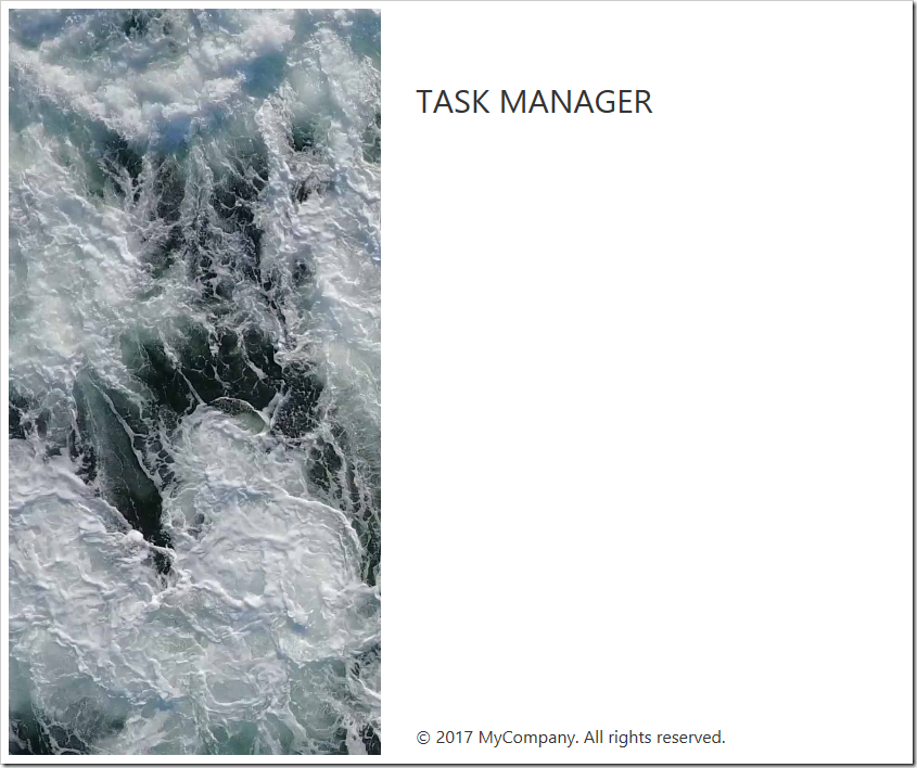Many app stores recommend the use of a splash screen showing a logo or app name when the app is first started. Apps created with release 8.6.0.0 will show a splash screen for 2 seconds when the user begins a new session. The application logo is displayed in the top right corner. The app footer text is displayed in the bottom right corner. A default background image is displayed on the left side.