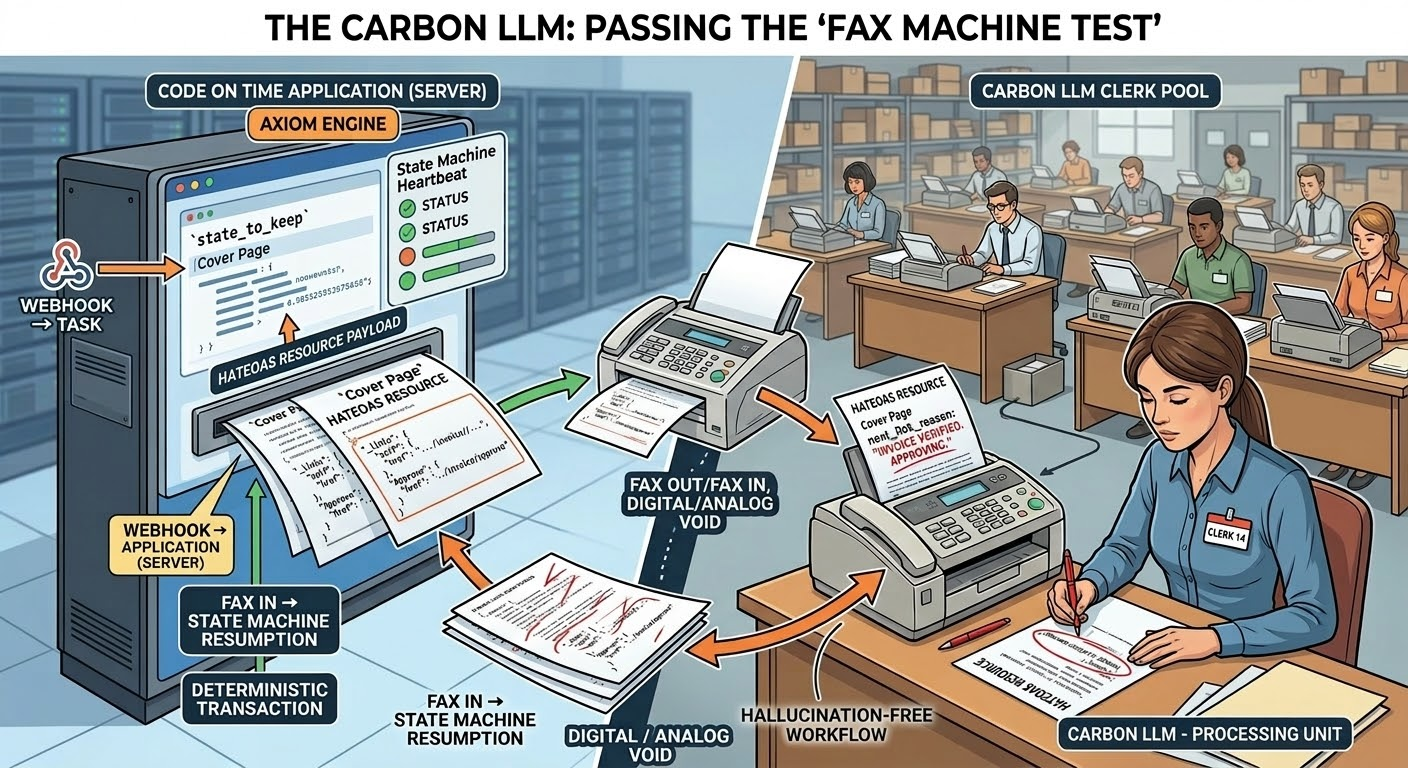 4. Carbon Inference: The fax machine transmits the paper to the "Carbon LLM" (the warehouse clerk pool). A human clerk reviews the goal ledger, analyzes the HATEOAS resource, and circles the most logical link to move toward the goal. They write their next_link_reason on the page and fax it back.