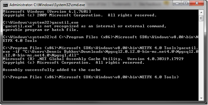 Next, run the following line to register the data provider in the Global Assembly Cache. Make sure to use the correct path to the extracted “Npgsql.dll” file.