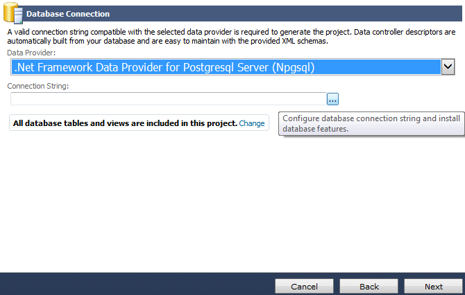 On the Database Connection page, select “.Net Framework Data Provider for Posgresql Server” for Data Provider. Then, click on the “…” button next to Connection String field.
