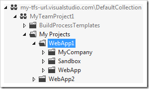 Note that Mobile Factory and Web Site Factory apps are contained under a master folder with the same name as the application project. The master folder also stores the Visual Studio solution file for the project. This is how TFS organizes projects of these types.