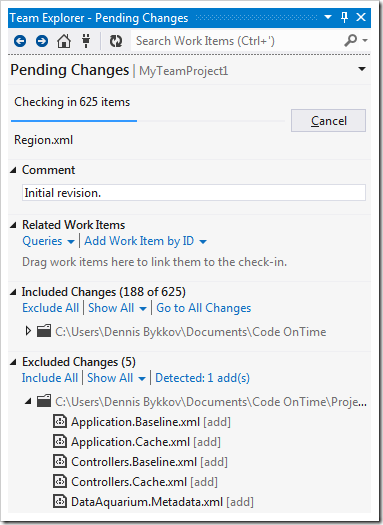 Press the Back icon on the Team Explorer toolbar, and then press Check In.