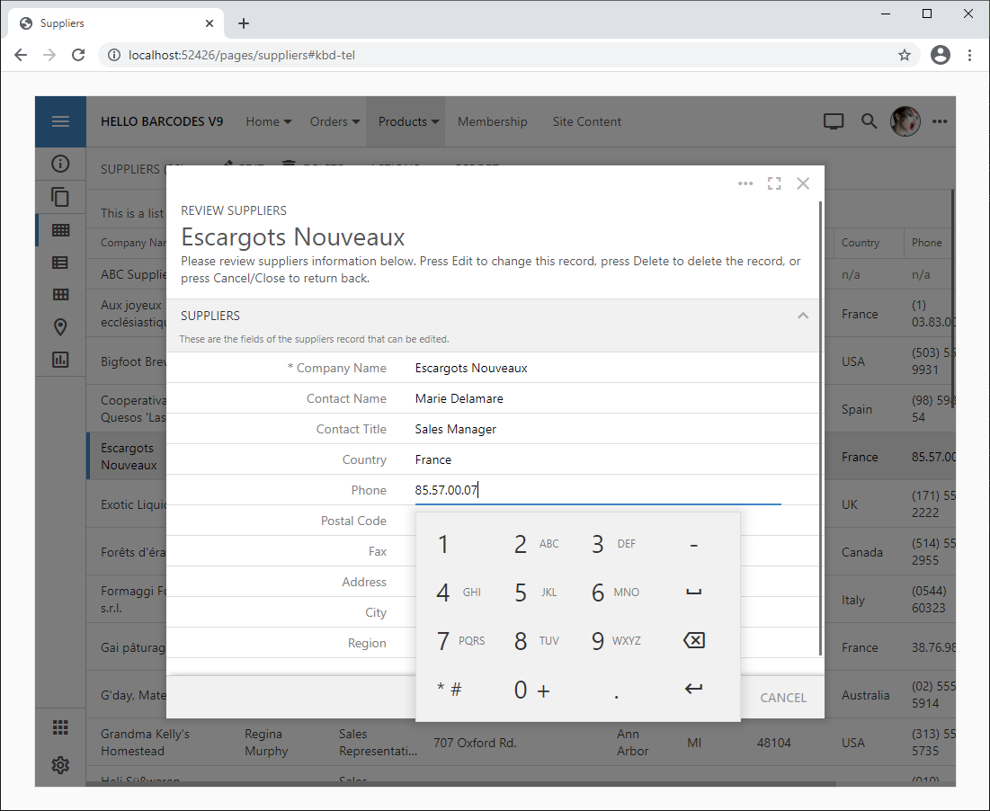 Tag the data field Home Phone as kbd-tel-auto and the telephone virtual keyboard will be displayed for the field and server as the filter of acceptable characters on any type of screen.