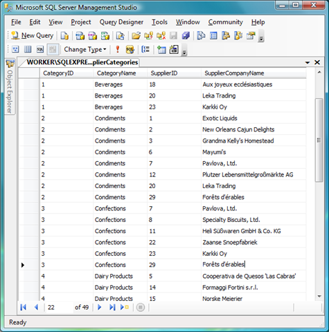 We have to create a database view to allow us implementation of category lookup discussed above. Please execute the following script to create view SupplierCategories in the Northwind database.