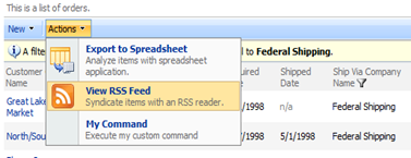You can see this feed live at http://dev.codeontime.com/demo/NWBlob/Export.ashx?q=PHEgYz0iT3JkZXJzIiB2PSJncmlkMSIgcz0iT3JkZXJEYXRlIGRlc2MiIGU9IkV4cG9ydFJzcyI%2bPGY%2bU2hpcFZpYUNvbXBhbnlOYW1lOj1GZWRlcmFsIFNoaXBwaW5nPC9mPjwvcT4%3d.