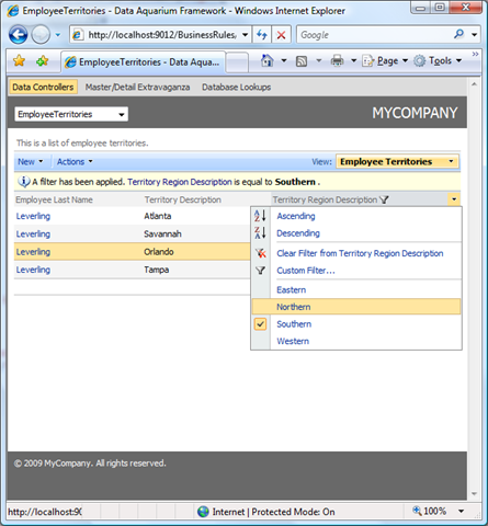 List of employee territories is filtered by a region.