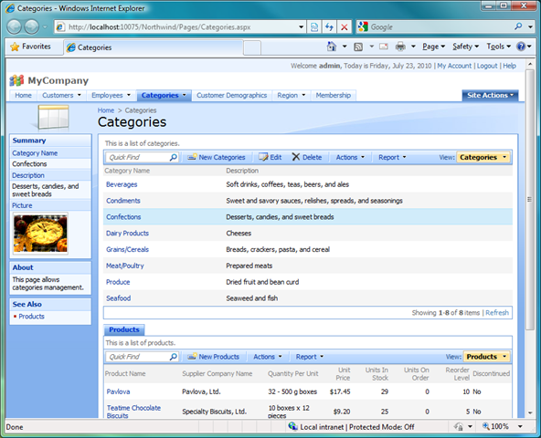 For example, suppose you have generated the Northwind sample application with Web Site Factory. The grid view of product categories will show each category inline as you can see at http://dev.codeontime.com/demo/websitefactory1/pages/categories.aspx. If you select a category then the category Picture will be displayed in the summary on the side bar as well.