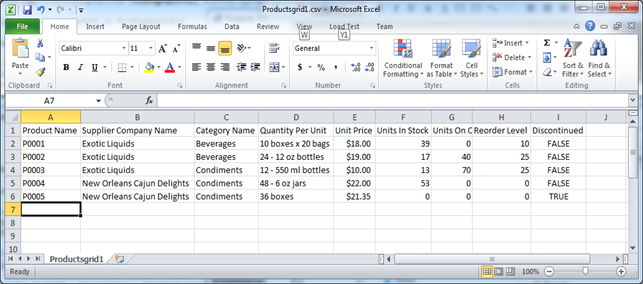Save the template to your hard drive and enter several sample values. The following screenshot shows five sample products. Notice that lookup values Supplier Company Name and Category Name are entered as text.