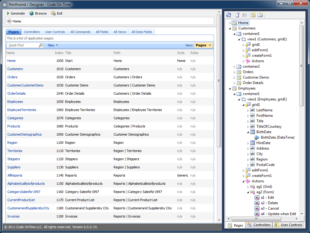 The tree on the Pages tab provides a unified view of all application resources including pages, containers, data views, fields, actions, and user controls.