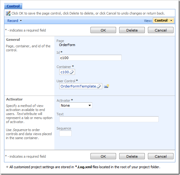 Let’s rearrange the Order Form page to make it easier for the end user to interact with the data. To do this, we will need to add a custom “Order Form Template” user control to the page.