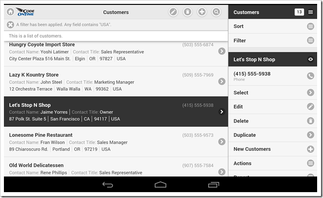 Note that a change in orientation will also reveal additional user interface elements. Actions “Edit”, “Delete” and “New” are visible on the application toolbar in the top right corner of the screen. Action “Edit” is the only available choice available on the mobile phone with a portrait orientation. Mobile apps created with Code On Time have a responsive design that ensures optimal viewing on a device with any screen size.