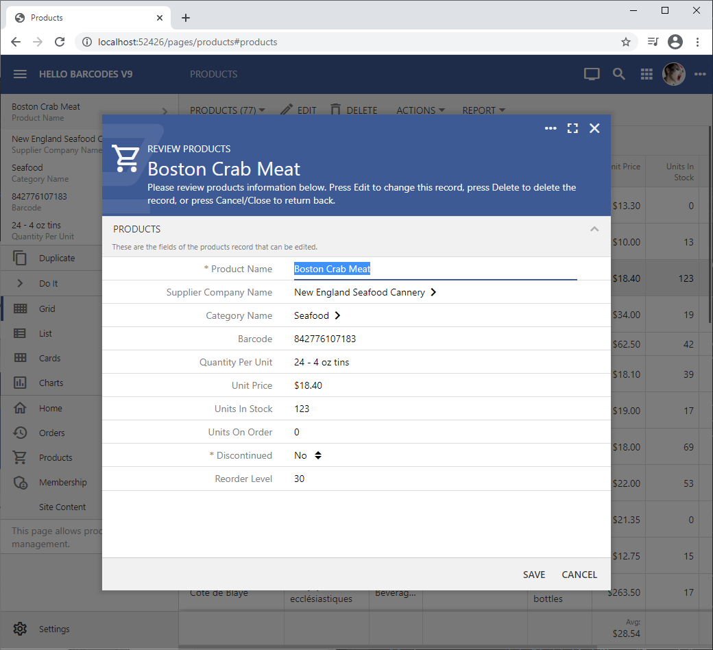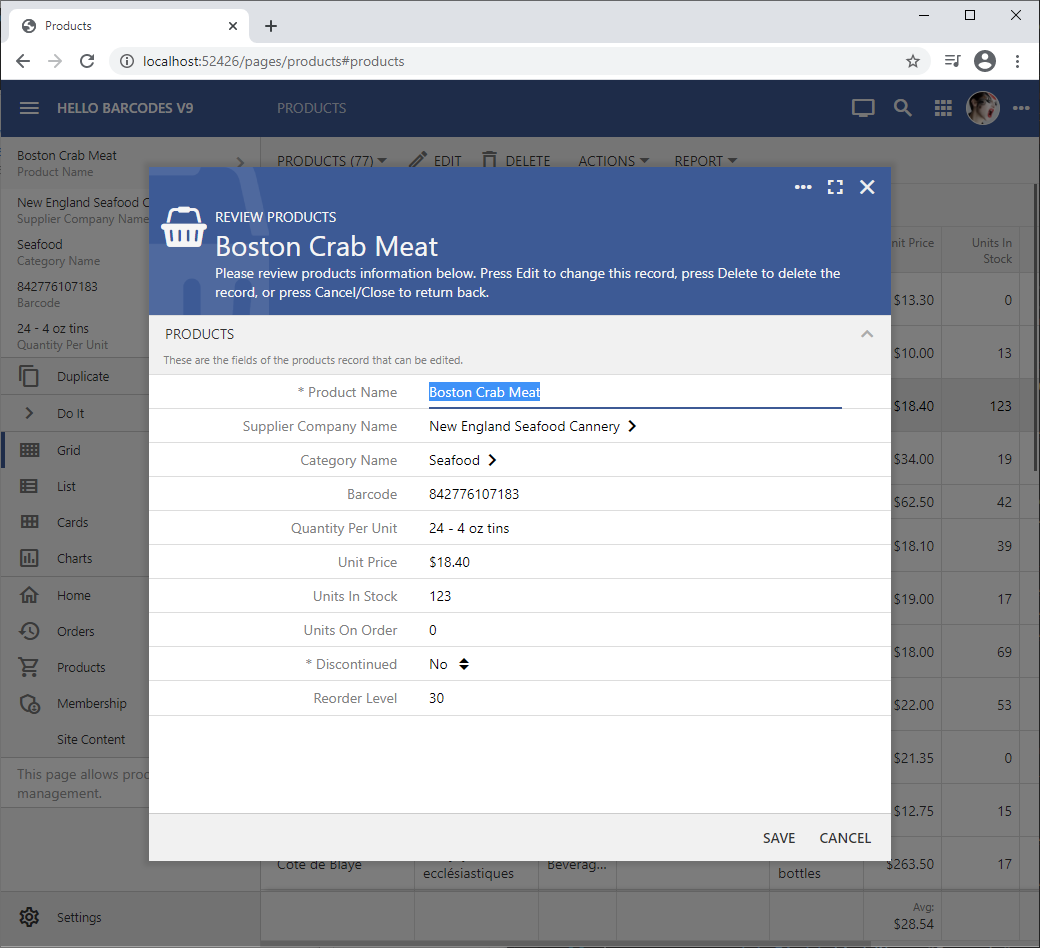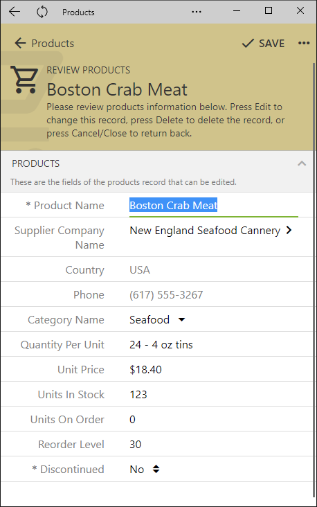 Let’s apply the standard icon shopping_cart to the editForm1 view in the Products data controller. Open your app in the Project Designer, find the view, and enter material-icon-shopping-cart in the Tags property.