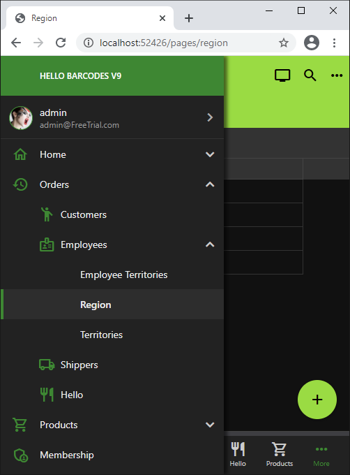 Assign icons to actions and pages by entering the icon name in their Icon / Custom Style property. For example, icons fa-truck and fa-coffee are assigned to the Shippers page and custom action Take a Break in the screenshots. The icons will show on the sidebar, in the navigation tabs, and in the menu options.