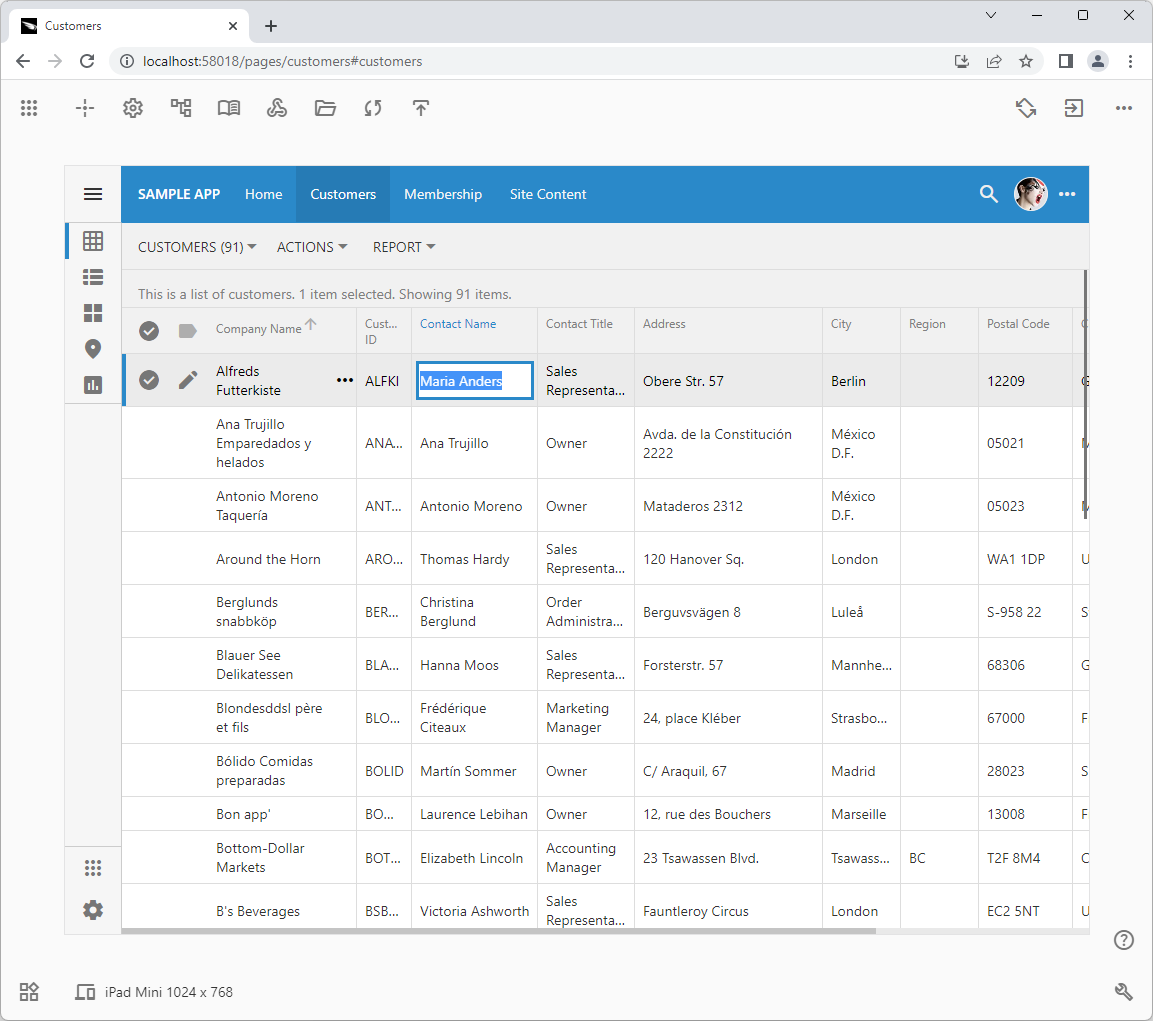 Then the inline editor is activated by the $app.touch.edit.activate method. The inline editor is the data view with a dynamic form that overlays the grid. Only the focused field is visible in the form. The form is sized to cover the grid cell. A tap on another field in the same row will reveal the field in the form. Users can navigate the row fields with the Tab and arrow keys. The form field values are saved when users tap outside of the row or press the Enter key. Our business rule sets the focus on the Contact Name field by calling the focus method of the dataview instance extension.