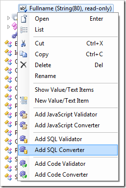 Right-click on Employees / Fields / FullName (String(80), read-only) node, and press Add SQL Converter.