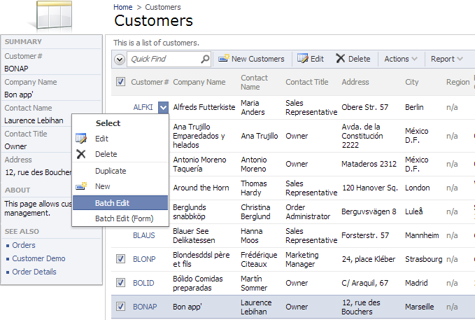 To perform a batch edit, first check the boxes next to several rows in a grid. Using the context menu, click on the “Batch Edit” action.