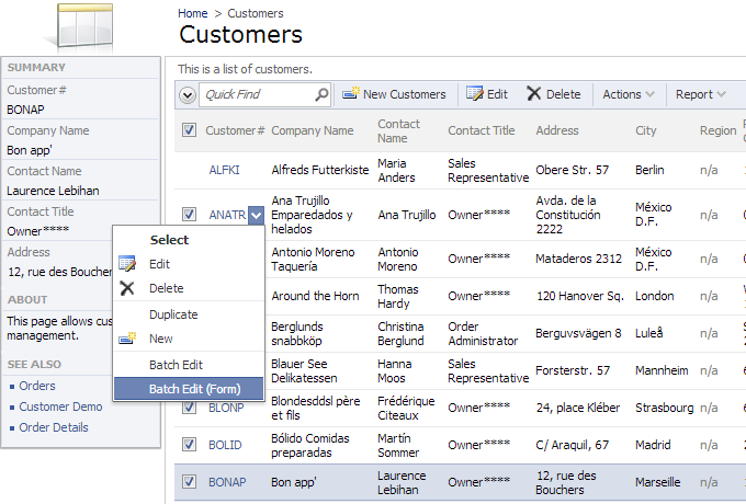 Batch edit can also be performed in the form. Check the boxes next to the rows to update. Use the context menu to select Batch Edit (Form) action.