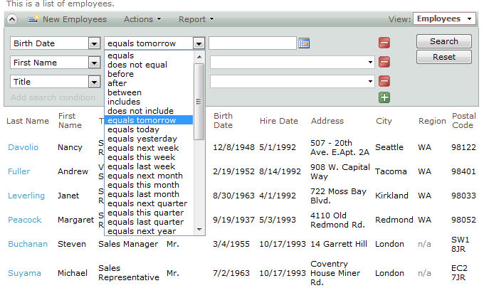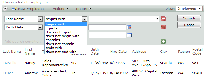 Let’s require users to search by the Birth Date field on the Employees grid view, and only permit between, equals, and includes search options.