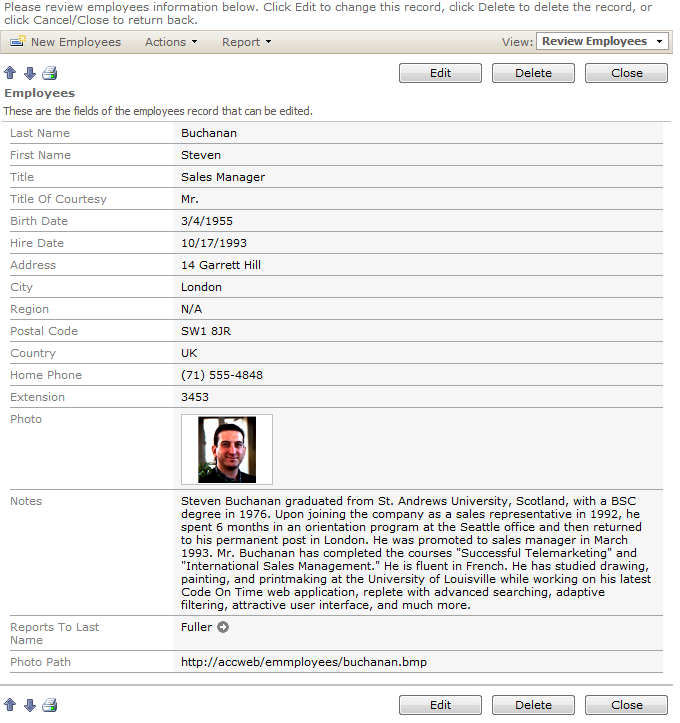 When the web application opens in your default browser, navigate to the Employees tab and view an employee record. The entire text of the field is displayed.