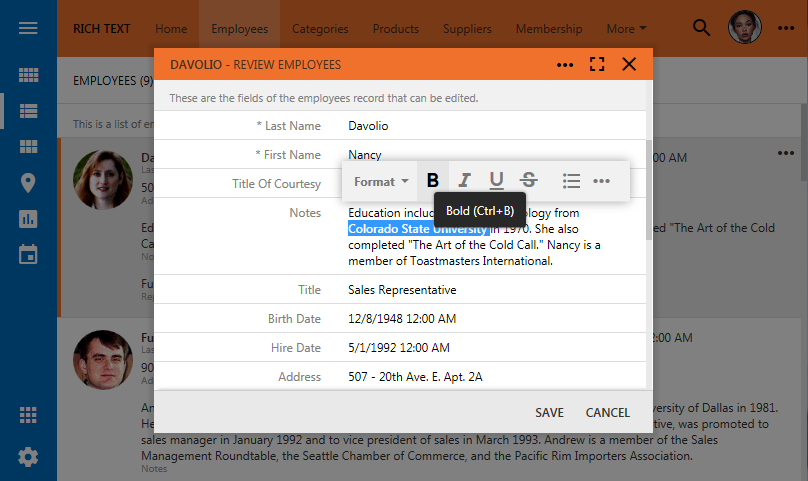 The implementation of rich text formatting is based on the native content editing capabilities of the modern browsers. Applicaiton frameowork will use P tag to format paragraphs accross different platforms and strip all formatting when the text is pasted from the clipboard. The implementation of rich formatting is touch friendly. The new RTF editing support will be also utilized in the upcoming page builder of the built-in Content Management System (CMS) available in the apps created with Code On Time.
