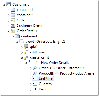 Start the Project Designer. Double-click on Customers / Order Details / container1 / view1 / createForm1 / c1 – New Order Details / UnitPrice data field node.