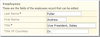 Navigate to the Employees page and edit the details of a record. The First Name field is not marked as required, but the Title is.