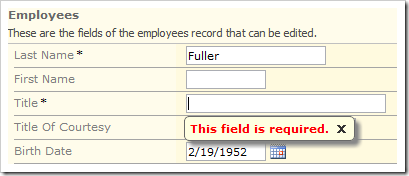 Enter a value in Title and save again. This time the action will be passed to the server. However, the FirstName column in Employees table is still marked as required in the database. An error message will be raised by the database engine and displayed at the top of the page. Changes will not be persisted.