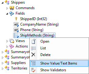 In the Project Explorer, right-click on the ShipMethods field, and select Show Value/Text Items.