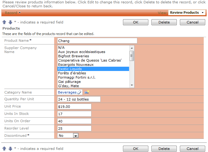 When the web application opens in your default web browser, navigate to the Products page and edit a record. The SupplierID field will have List Box item style. The list box displays five rows by default.