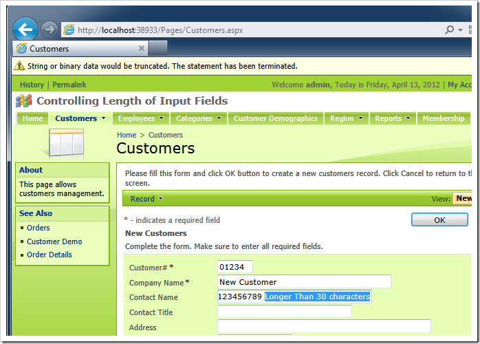 An error message is displayed if the Length property of the ContactName is cleared and more than 30 characters are enters when creating a new record.