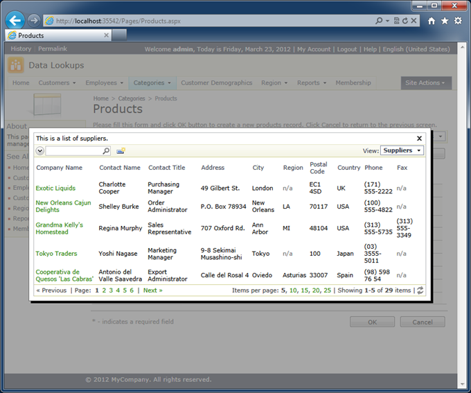This is the lookup window activated at runtime. The custom page size is set to “5”.