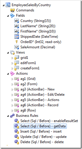 Another method to create a data controller is by defining a result set from an SQL query. This method can be used to display the results of stored procedures or other functions in the database. The “Define Data Controller” tool in the Project Designer allows specifying the SQL script and will compose the controller automatically. The controller will not have a command, and the Select action will be overridden with two SQL business rules. The first one will set EnableResultSet property to “true”. The application framework will then use the results of the second business rule to compose the result set. Three additional rules will prevent the user from triggering insert, update, and delete actions. An example can be seen below.