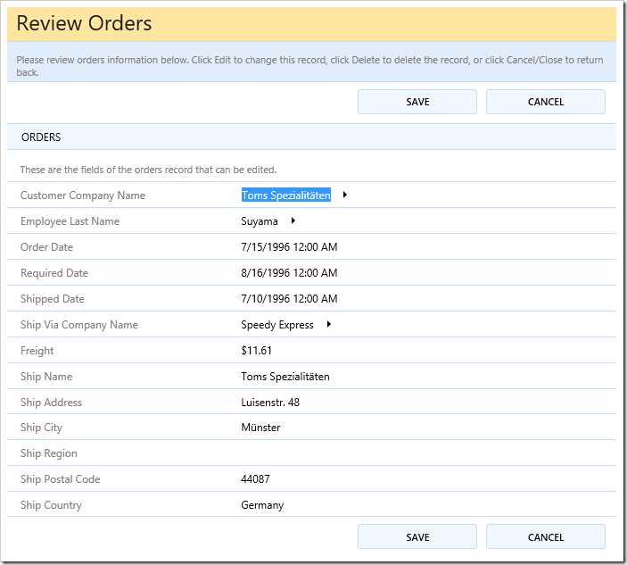 The picture below shows the automatically built template for the default editForm1 view of Orders controller in the sample Northwind app.