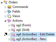Action groups are logical collections of actions. Each type action group is rendered differently in the user interface of a data controller view. There can only be one Grid, Form, Row, or Action Column action group, but there can be multiple Action Bar groups. Action groups are located under the Actions node of a controller in the Project Explorer.