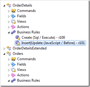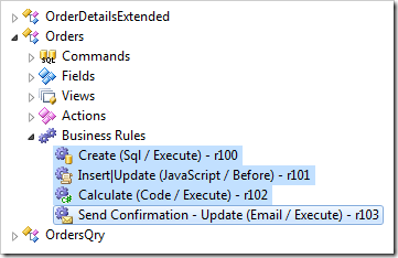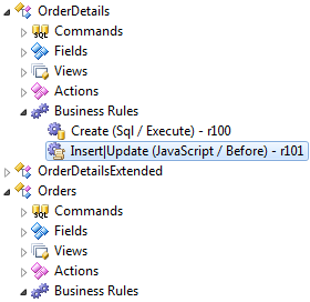 Business rules are located under the Business Rules node of a controller. The icon of a business rule is different for each business rule type: SQL, JavaScript, C#/Visual Basic, or Email.