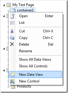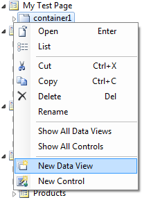 A data view can be created by activating the context menu on a container and selecting New Data View option.