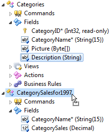 A field can be copied by dropping onto the controller or Fields node while holding Ctrl key. The name of the clone will be appended with a number, and the new field will be configured as a calculated field that reflects the physical column in the database. Use context menu option Copy on the field and use Paste on the controller or Fields node to create a clone.