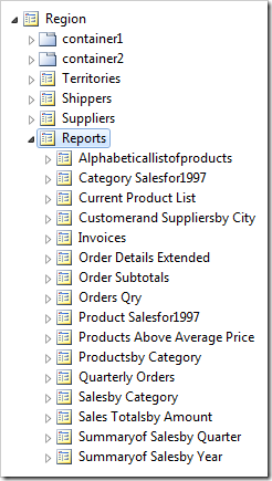 Any drag and drop operations will be based on the order of selection. For example, the pages below were selected in the order of Customers, Employees, Categories, Region, and dropped to the right of Home. This resulted in the pages being reordered to Home, Region, Categories, Employees, and Customers.
