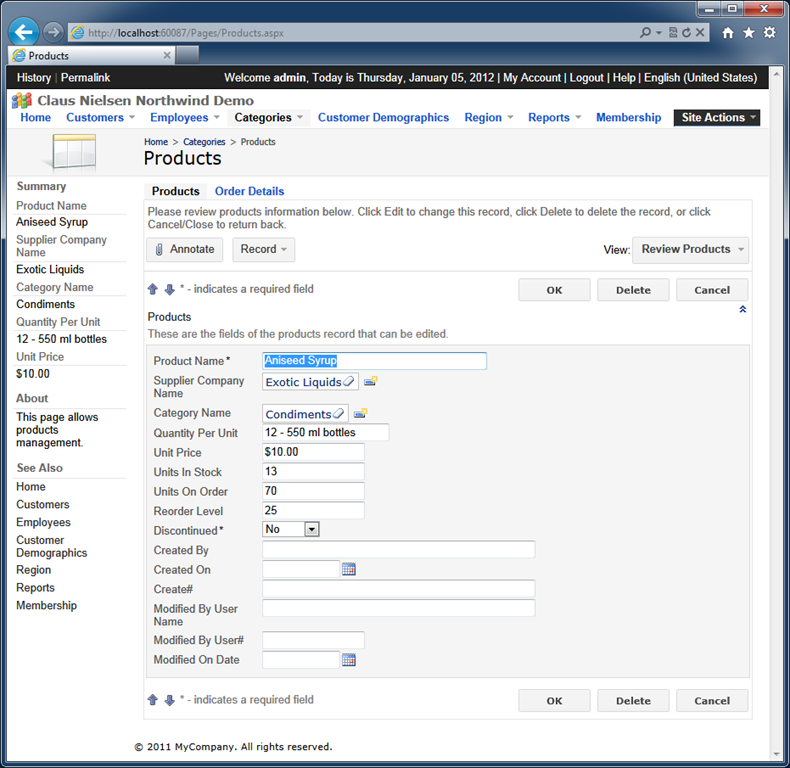 Locate the Products page in the generated web application and begin editing a product record. Here is our version of the Products page.