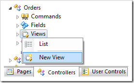 Start the Project Designer. In the Project Explorer, activate the Controllers tab. Right-click on Orders / Views node, and press New View.