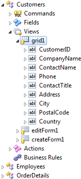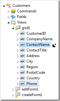Switch to the Project Designer. In the Project Explorer, activate the Controllers tab and expand to Customers / Views / grid1 data view node. Drag Phone data field and drop it on the right side of ContactName data field to place it after the target.