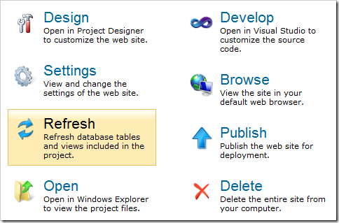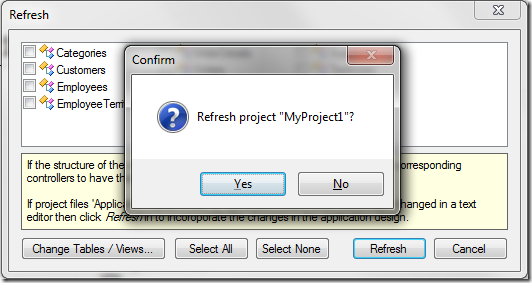 At some point during web application development with Code On Time, it may be required to change universal project configuration settings, add a table, or update an existing table definition. However, the web application generation process will not change the application pages and controllers without a project refresh.